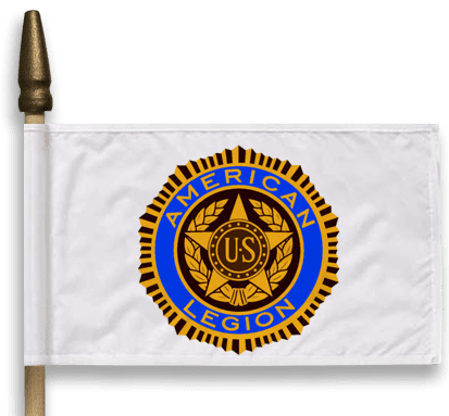 Excellent for indoor or outdoor use, Our American Legion Miniature Flags are made from sturdy 250 denier polynex. Each flag is attached to it's staff via pole hem not stapled, giving the flag a much richer look. Your flag comes mounted on a natural wood 24"x1/4" staff with a gold spear.